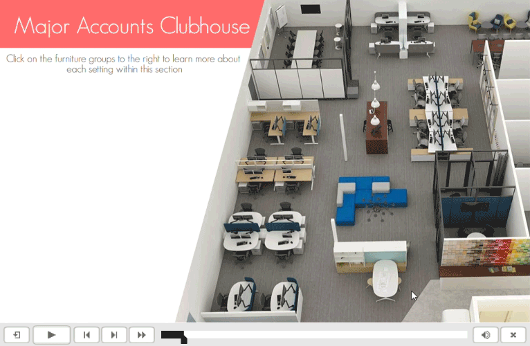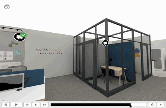 The training includes 360 degree images that allow learners to take an immersive tour of the space in virtual reality. Each images focuses on a unique area of the floor plan, and learners can look around, zoom in, and click on hotspots to learn more about different design features and products.
