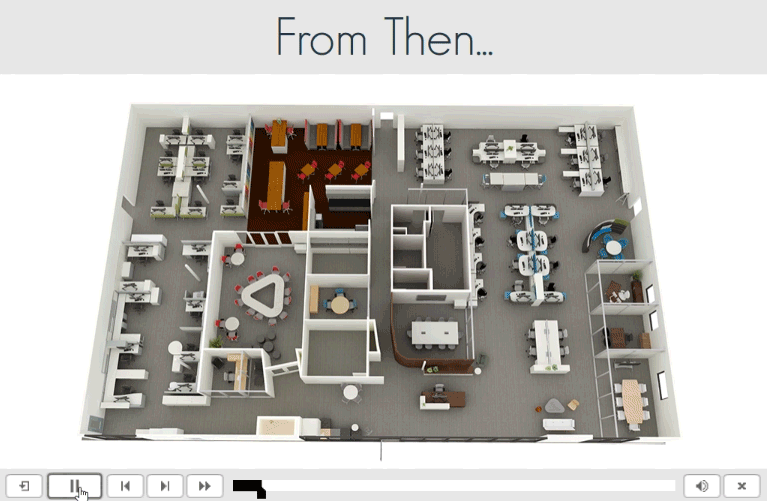 The training begins with a brief description of the layout, aesthetics, and pain points of the original space, and shows how it transformed into what it is today. This background information is intended to assist change management efforts by giving employees a frame of reference for their new space, while also providing salespeople with key improvement details to note during client tours.
