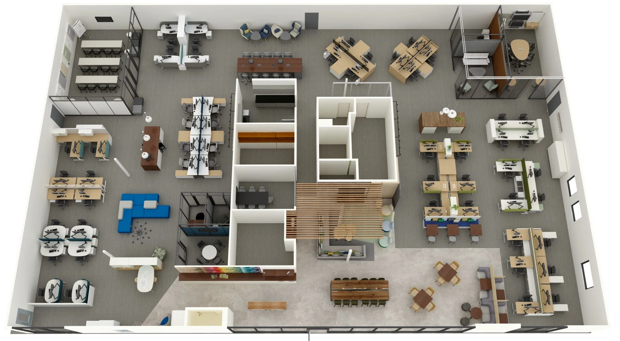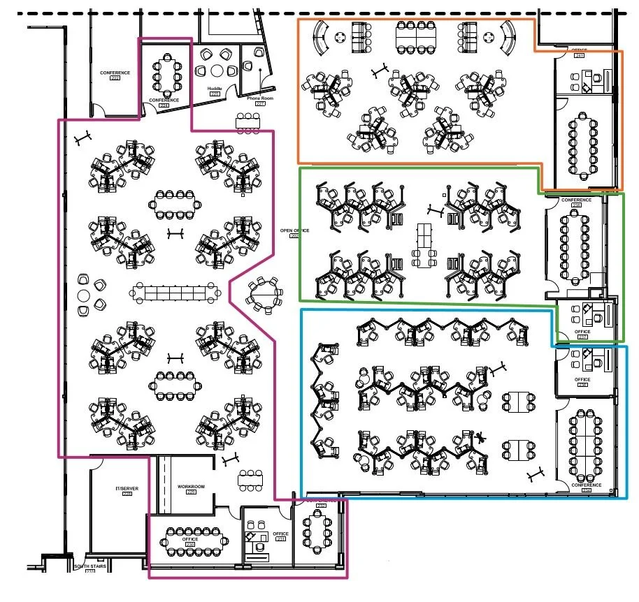 For the project above, the original block plan from the architect divided the space between four departments that would all utilize identical 6’ x 8’ workstations and small shared conference rooms around the perimeter of the building. These departments all had vastly different job roles that required varying levels of privacy and collaboration, though, and many teams needed dedicated group work spaces that could not be accommodated by the limited conference spaces available. By utilizing a 120 degree workstation system, the new design provided space for multiple open plan lounge and meeting spaces integrated into each department’s ‘neighborhood’ without having to expend the overall footprint. I used the system to create multiple layouts and configurations to support the unique activities performed by each group, all while using a simple universal kit of parts.