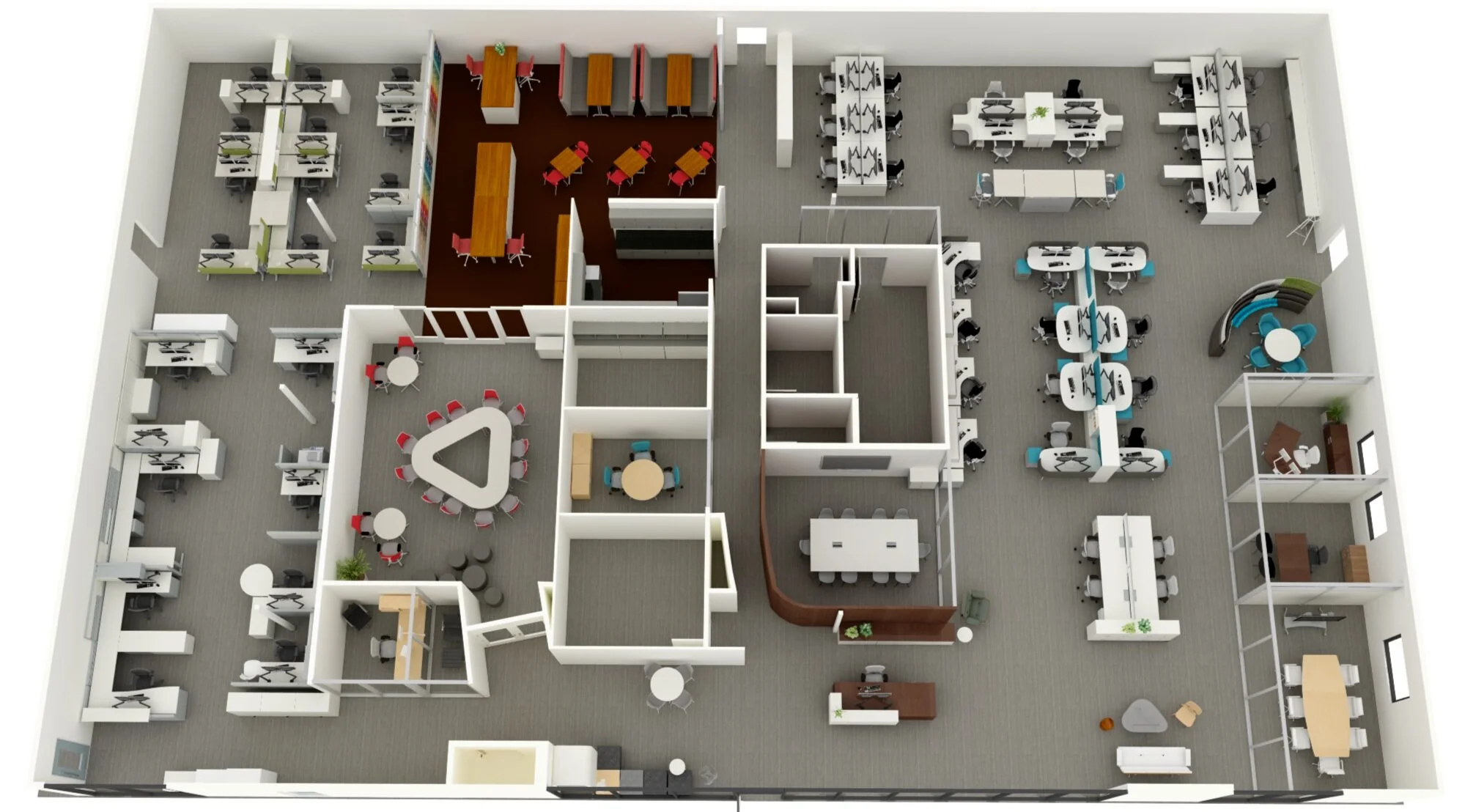 The images above display an office redesign that broke down physical barriers and brought teams together. By relocating larger conference rooms to the back of the space and reducing the height of workstation walls, this layout allowed for a more open plan setting that better supports work between cross functional groups. The plan is split between two main departments, each having a mix of dedicated and hoteling workstations, lounge spaces, and meeting rooms in their respective ‘neighborhoods’ with several amenity spaces in between to bridge the departments together. The small lunch area was relocated to the entrance and completely revamped into a work-lounge plaza space with a variety of furniture types and postures that can support everything from quick one-on-one chats to large all company meetings. And as this was a redesign of an existing space, almost all of the workstations were reused in the final design with certain tweaks to the finishes and reconfigurations of the layouts in order to fit the updated aesthetic and functionality of the new space.