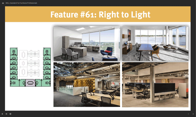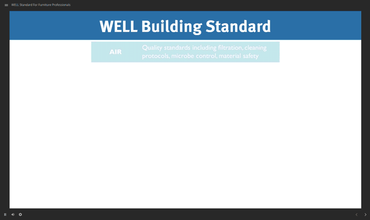 Many of the features in the WELL Building Standard fall under the responsibility of other team members like Architects and Engineers, but there are a substantial amount that can be addressed directly by furniture professionals. Once the learners gain a general understanding of each of the 7 concepts, the training takes a deep dive into the specific features that they can address, as well as real work examples of products and strategies they can use.
